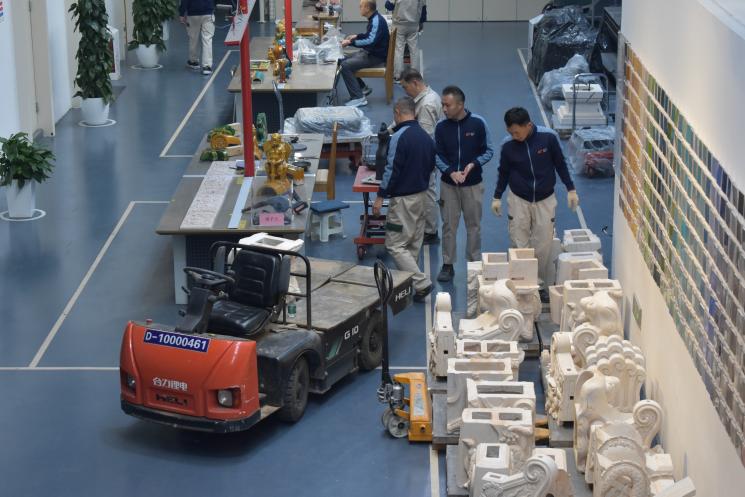 金隅琉璃文化创意产业园位于北京市门头沟区历史文化名村琉璃渠村,是北京金隅集团顺应首都功能定位,以保护传承琉璃烧制技艺为核心倾力打造的传承 700 余年琉璃文化历史的现代文化创意产业园区,园区前身为始建于元 1263 年,历经元、明、清三朝的皇宫御窑厂,2008 年获评国家级非物质文化遗产传承单位,其琉璃烧制技艺位列国家级非物质文化遗产名录。在园区专业人员的全程引导下,师生们依次走访了琉璃龙凤壁、脊兽大道、琉璃文化展厅、生产厂房、老窑遗址等核心区域。在琉璃龙凤壁前,同学们了解了官窑标准与质量底线的传承;行走在按故宫太和殿规制复原的脊兽大道上,大家感受到传统建筑美学的精髓;琉璃文化展厅系统展示了琉璃技艺的千年发展脉络;生产厂房内,传统“上三作”工艺的现场演示让人叹为观止。最令人振奋的是,师生们恰逢非遗工匠正在进行琉璃烧制工作,观摩了这一珍贵技艺的现场操作,深刻体会到传统工艺的精湛与匠心独运。