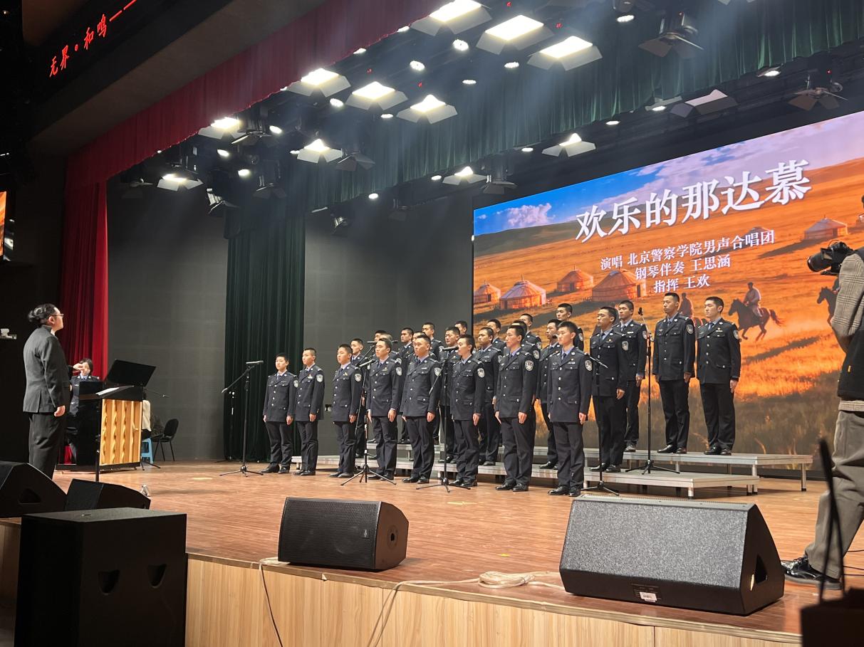 音乐会由北京警察学院男声合唱团开场,在指挥王欢带领下,以《欢乐的那达慕》惊艳亮相,钢琴伴奏王思涵的灵动旋律与成员们豪迈苍劲的歌声相融,鲜活展现出草原那达慕的欢腾与牧民的淳朴热情,雄浑和声瞬间点燃现场,尽显兄弟院校艺术团体的深厚功底,赢得满堂喝彩。