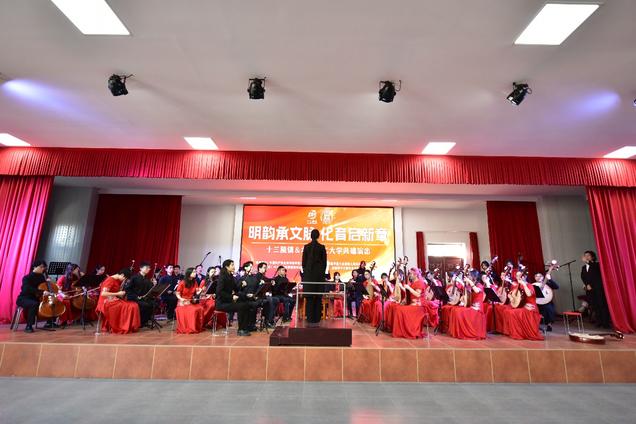 演出伊始,校民族管弦乐团率先登场,以《好汉歌》的雄浑豪迈拉开序幕,铿锵节奏瞬间点燃现场氛围;随后《敢问路在何方》的经典旋律婉转流淌,诉说着探索与执着的信念;与胡庄社区大明风华民乐团合奏的《金蛇狂舞》,音符灵动跳跃,将节日喜庆与邻里温情诠释得淋漓尽致。